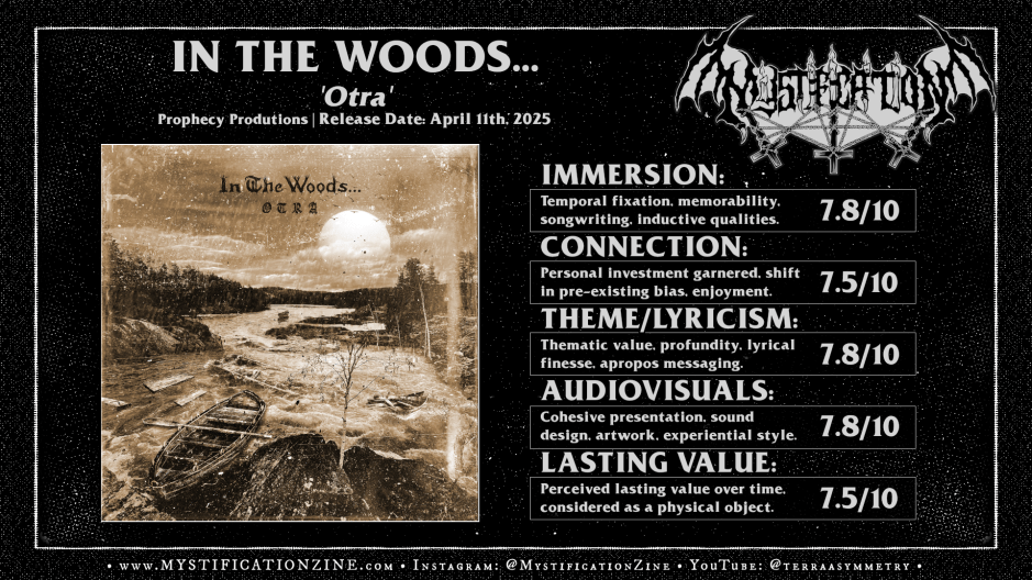 For their seventh full-length album Kristiansand, Norway-borne melodic metal band IN THE WOODS… craft an ode to and stories about a river, ‘Otra‘, which flows through their southern region. Within each of these seven lengthier mid-paced progressive rock/metal inspired pieces they’ve managed folkish chanson, laid back and altogether contemplative songs with a few spikes of extreme metal interest. If you’re looking for their earliest auld ways from the 90’s this is several lives beyond that point, two total reworked line-ups beyond their reformation in 2014. Overall expect more of a dramatic poetically stated melodic progressive metal album, moderately eclectic but focused on one specific feeling that runs through the majority of this glum, moodier narrative. New vocalist Bernt Fjellestad (ex-Guardians of Time, ex-Suspiria) surely has a sort of power metal vibrato under his control but his presence is understated, there to carry a tune and lead the bands roll through its highs and lows. For my own taste they don’t necessarily top the Amorphis-esque ride through “A Misrepresentation of I” here though I’d enjoyed the pagan/black edge given to “Come Ye Sinners”. Not fully my kind of thing but also not a bad record at all.