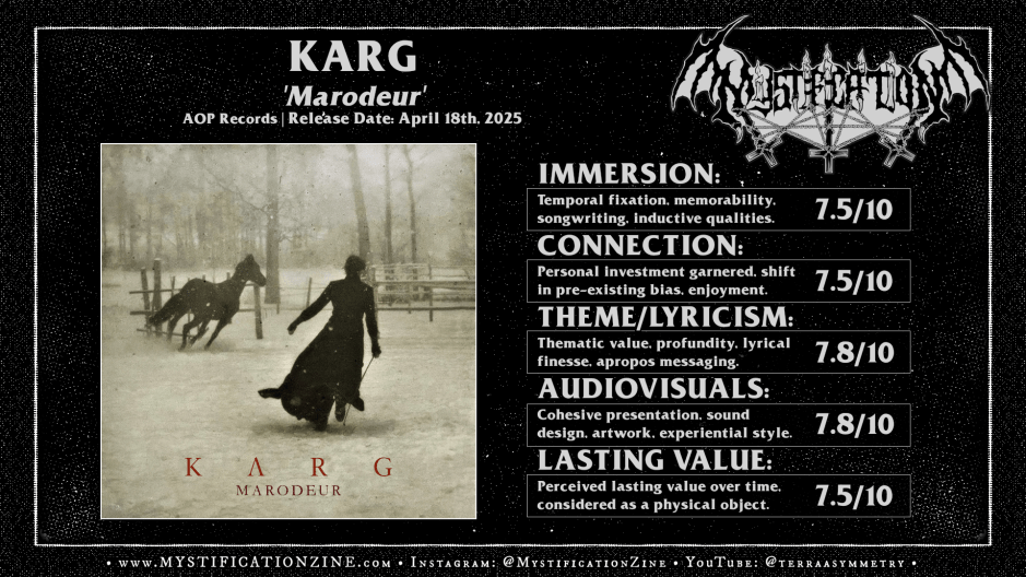 This ninth full-length album from Salzburg, Austria-based atmospheric black metal/post-black metal act KARG is the first written in collaboration with vocalist and founder Michael “J.J.” Kogler involving the full quintet and a host of guests in the process. While the previous album had benefitted from a large collective of folks and their performances there is something different in the air for ‘Marodeur‘, something like a modern ideation of dark metal (see: “Yūgen”) and even some melodic death type major key upturns (“Annapurna”) as all three guitarists from ‘Resignation‘ (2022) bring their own touch where possible. Of course as is the case with Kogler‘s presence in Harakiri for the Sky his narrative shouted diction is not for everyone, I find it distinct and impassioned even after so many records in this style. That said a lot of the most interesting parts of this album takes cues from alt-metal, popular rock music, and such which is great for the sake of variety but also slightly beyond the pale here and there. “Reminiszenzen einer Jugend” features what is probably the best out of character moment in this regard. Of course the old complaints still persist from my point of view, the album is overlong and the rhythmic bones of each song is yet fairly similar to suit the narrative device/diction.