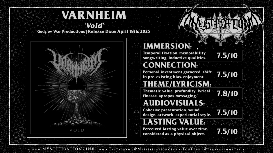 For their third full-length album Płock, Poland-based quartet VARNHEIM have fully gravitated toward longform pieces (~10 minutes each) in their divination of ‘Void‘ a modestly eclectic record which makes good use of harsh/dark ambient features, varietally drifting epics, and guitar techniques common to modern Polish black metal crews. Many of these songs appear perhaps more creatively struck for the sake of their dressings, accoutrement and extended post-metallic intros which explore outside of the black metal mainframe but the actual bulk of the riffing and looser structured movements don’t always matchup to that profundity. This is especially true for the somewhat bland innards of “Inwards” yet it works brilliantly for opener “Vengeance”. The whole of the listening experience is immersive per its structure, four pieces which are easy to fall into and roll with, though it definitely felt like the first half of the record had a lot more to say than the second half.