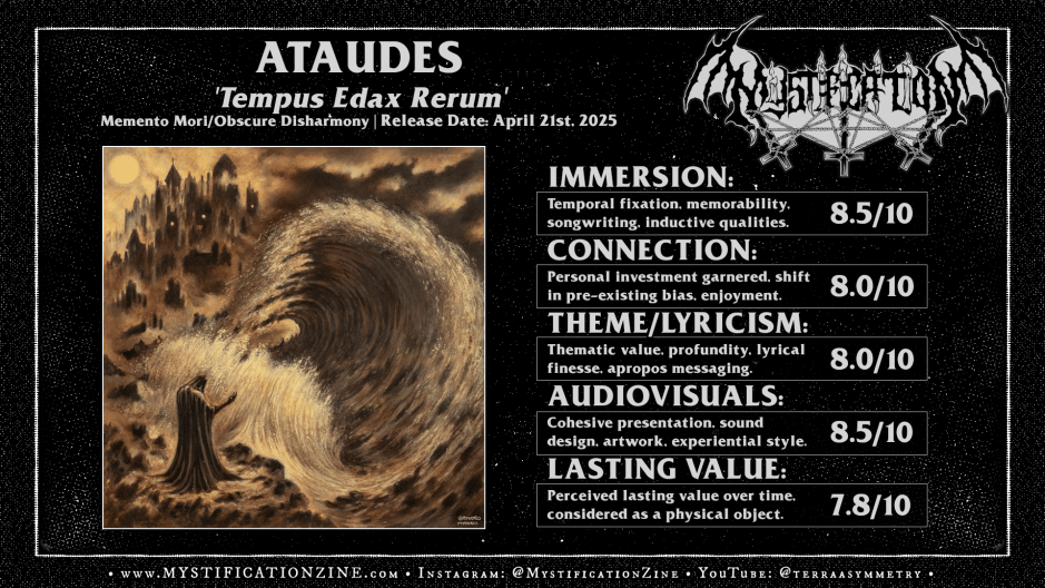 With our primeval engine left whirring off-cylinder and expended of every last telomeric extension our ancient clock is left to flatly rattle through its timeworn exterior as the caustic remnants of the “self” are soured by discord and tempest ’til eroded… settled into putrid dust by the wrathful degrade of Buenos Aires, Argentina-based death metal trio ATAUDES who’d repeatedly conjure their decayed tones with the temperament of an ageless ghoul on this impressive sophomore full-length album. ‘Tempus Edax Rerum‘ presents time as the unsettling source of angst within mankind, an incontrovertible devourer of existence (and remembrance) as the nihil pours bile-black and reeking from each piece. Their work on this second LP smacks of paradigmatic soul-exchange, a dramatic shift in voicing which better attains (and elevates) their original vision of morbid, angularly cut death metal rippling with eerie-toned atmospheric descent.