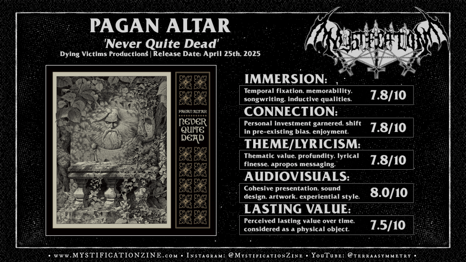 Returned from the shadows with tales of occult and folken fascination the legendary oaken drift of London, England-borne heavy/doom metal band PAGAN ALTAR manifests an unexpected return with this fifth full-length album. ‘Never Quite Dead‘ exists in purgatorial state, unsure if it will be a transitional moment to tarry on with or a final headstone which hangs thick with its mournful spiritus. Though the feeling that their head wizard is gone still rings in mind this latest clutch of songs is nonetheless worthy of the band’s humble history as storytellers and underground heavy rock and proto-doom die hards willing to press on against the odds.
