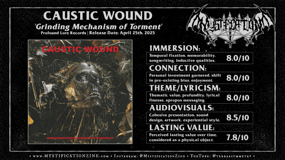 As the product of humanity’s stymied and murderous future-now state of mind, which only grows more calloused and chaotic day after day, this sophomore full-length album from Seattle, Washington-based death metal/grindcore quintet CAUSTIC WOUND illustrates the horror and torture of the present day appropriately via their unhinged, unrepentant delivery. A natural step taken beyond their celebrated debut ‘Grinding Mechanism of Torment‘ might be a hair more precise in its shot-gunned pursuit of ‘old school’ deathgrind but only for the sake of imposing presence, that same classics-aware fusion holds true. As a heightened experience of frenzied brutality, eye-gouging aggression and hard-cut lines beyond their last expect a fresh angle rather than a full redirection herein, a second application of nowadays death metal’s putrid immensity with primed late 80’s/early 90’s death-grind impact in mind.
