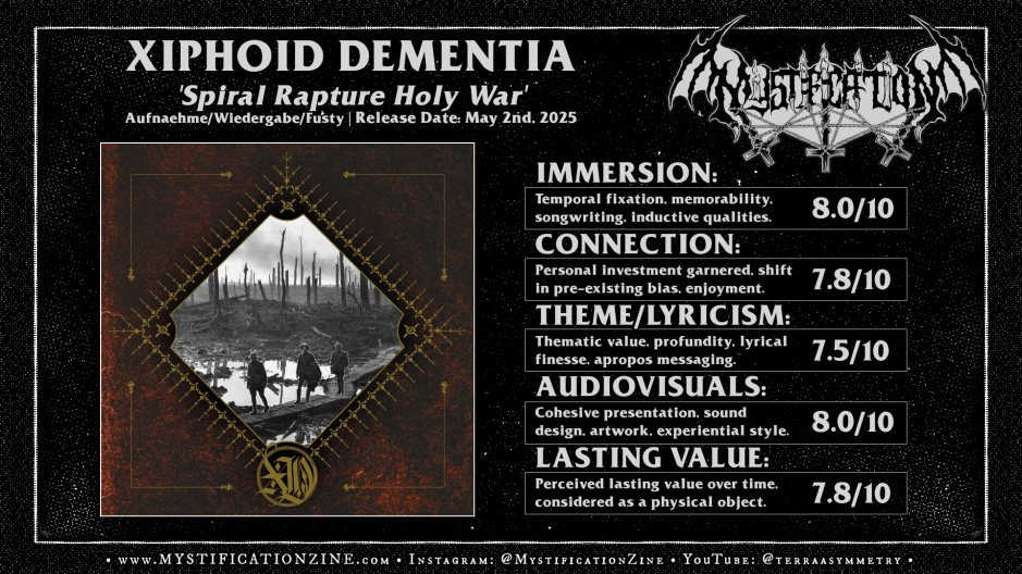 Though power electronics adjacent and/or enriched music are few and far between in terms of my own niche electronic music tourism there is some broader appeal in both the collective, largely cohesive directorial composure of ‘Spiral Rapture Holy War‘ which renders it easy to recommend to the experimental music diviner of any shape. My own interest in martial industrial, dire-toned neofolk, and post-industrial inspired metal primed me well enough upon approach and as it turns out Xiphoid Dementia are less of a headache or ear traumatizer than expected even during extensive spans of listening. Beyond style the suggested themes, artwork and overall design of this album come with the artist at peak form thus far, offering a high point of both craft and conception. A moderately high recommendation.