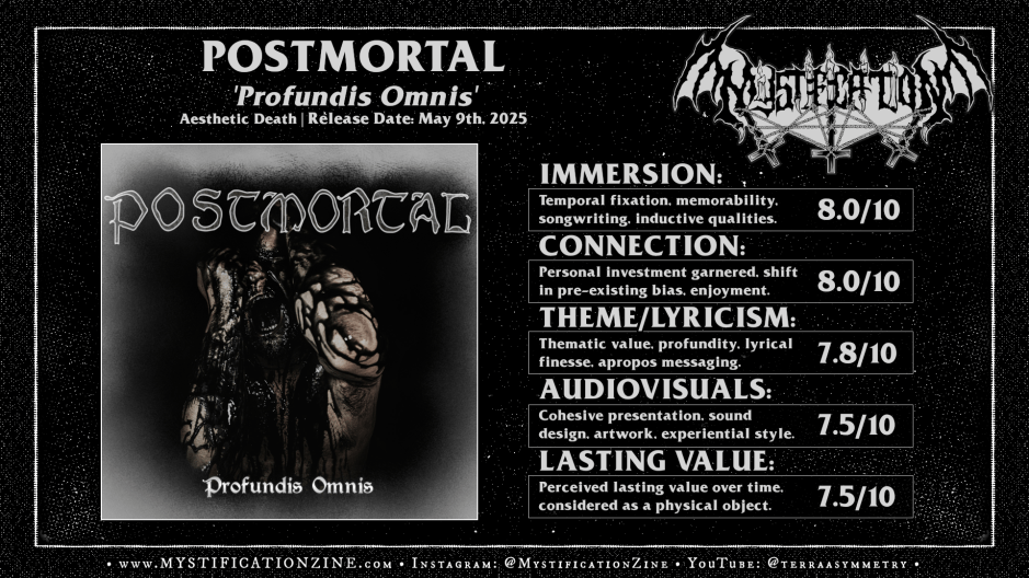 What’d appeared to be a bare bones, stripped back death/doom metal album going through the motions at face value ultimately turned out to be an inspired, impactful and immersive debut LP once I’d taken the time to sit and let it ring in mind. The caustic edge of Postmortal is affecting, not outright emotionally cathartic in my experience so much as suffocating in its anxious existential search where dark wonderment and oppressive dread coalesce. I’d reiterate that ‘Profundis Omnis‘ will likely best serve those who’ve patience for funeral doom metal’s earlier dramatic gloom and not just the heavier-handed spectrum of atmospheric death/doom metal. Fans of death/doom metal should definitely check this album out even if it isn’t a recreation of the raw violent outbursts of the early 90’s, otherwise the greater die-hard funeral death/doom metal fandom should appreciate this one most. A moderately high recommendation.