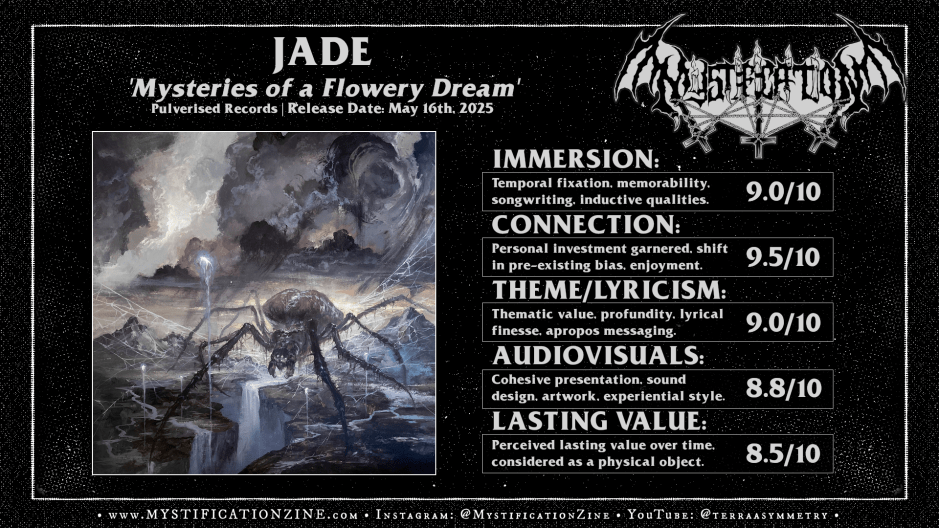 The melodious fixation of ‘Mysteries of a Flowery Dream‘ ultimately reads as conviction, a record which moves with purpose without building anything too overwrought or grotesque beyond the pleasure of listening. There is some strong emotional divination set behind these works which balances well with Jade‘s ambitiously scaled feats of composition otherwise, making for a fully engaged and dramatic death metal experience. Though their sound is changed and the whole of the record feels like a sluice to start it manages to provide just enough respite for the surreal impact of the whole gig to land with their own familiar eccentricity. A very high recommendation.