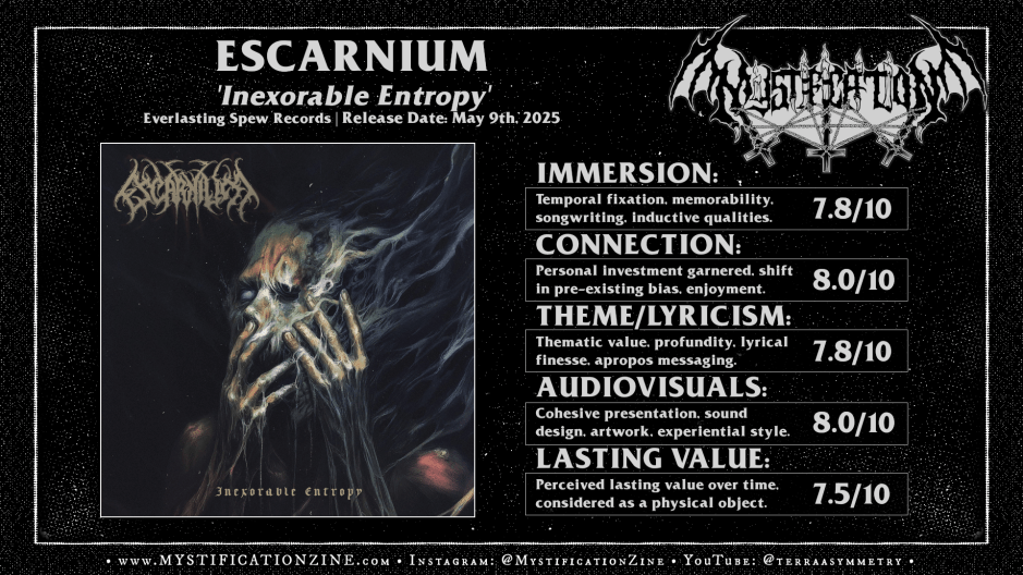 Though I’m not sure the brevity of ‘Inexorable Entropy‘ is its best characteristic it nonetheless feels modestly substantive for its density, offering mild variety beyond the usual while still inhabiting a recognizable sort of place and pacing for this version of Escarnium. I’d found the full listen was captivating upon introduction and enjoyable for its general trade-off of stylized pacing once familiar yet the great impact of my time with it was only just skin deep beyond a certain point. This is entirely fine for a death metal album from an artist with a ‘no bullshit’ policy in hand though it didn’t make for an album that’d fully stuck with me, at least not far beyond appreciation for some rad atmo-death sounds and brutal vibes. A moderately high recommendation.