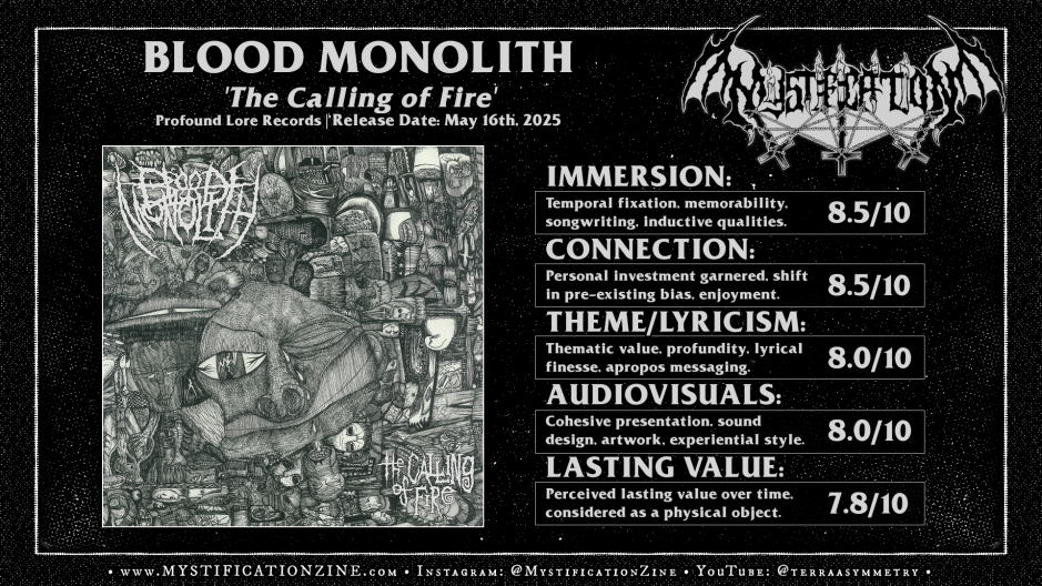 I’d appreciated that Blood Monolith don’t necessarily sound like everyone else’s gear today and that goes for their aesthetic choices, too, as the circa ’81 cover art by Nick Blinko of Rudimentary Peni infamy isn’t an obvious or safe choice. Blinko‘s work is dense with imagery and an affected hand which suits both the level of detail in this work and the frustrated lyrical focus of the record. I’ve no knowledge of any overarching theme beyond defiance of our tech-bro apocalyptic overlords and the endtime cull of corporate oppression but even that thought stands out as part of the ‘punks making death metal’ feel of their curation here. Though there is some potential for big personality here the big draw for my own taste is the directness of Blood Monolith‘s craft, no ulterior angle beyond the fist in face, which’d consistently pulled me back in for countless rounds with ‘The Calling of Fire‘. We could still consider it foundational work but achieved at a well above-average standard nonetheless. A high recommendation.