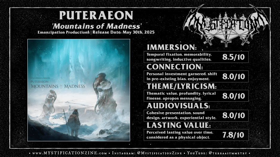 Around the time Puteraeon released ‘The Cthulhian Pulse: Call From The Dead City‘ in 2020 I’d been playing The Sinking City extensively (perhaps due to the pandemia of the time) and I’d associated that concept album’s immersive qualities with the game’s own pit of intrigue. It was an upgrade in most respects. For the band it was maybe a closer strike to their earlier intent, something with a bit more of a melodic centre point and a sound given to the capable hands of Dan Swanö for its render, making for a not-so typical feeling with the atmosphere that’d been lacking in their work since ‘The Esoteric Order‘. From my point of view fourth LP put things into perspective that the first album was unexpectedly received, the next two just kind of happened and over time, and they’d decided to put more time and care into future works to make sure they counted. I feel like this thought holds up well sitting with ‘Mountains of Madness‘ five years beyond their last record, finding it even more of their own thing.