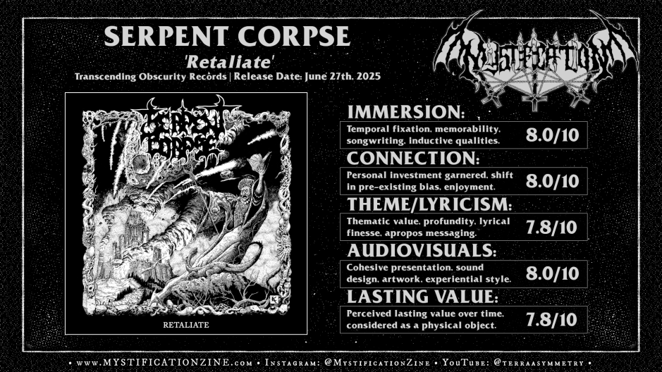 If you’re stoked on more Serpent Corpse and arrive upon ‘Retaliate‘ wanting a continuation of and moderation elaboration upon the forms they’d introduced on their first album you’ll likely enjoy this record. I went in with this band’s sound pretty fresh in mind and was reminded why I’d heard more than just potential back in 2023. What this release doesn’t do is eclipse or roll past where they took it before, at least beyond playing around with some different movement and seeing what they could manage within some longer pieces. Beyond that thought I was glad to see the production values still bumping and the cover artwork (via Lucas Korte) delivering another fantastic scene. I’ll be interesting to see what they come up with in the future by way of a few big lineup changes but per this release these folks are still on a roll. A high recommendation.