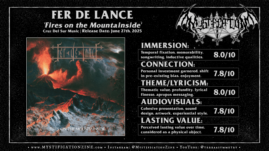 We venture where most would flee or fall as the hammering within Hephaestus’ forge beckons, all warriors driven toward the scalding challenge of Orodruin as Chicago, Illinois-based epic heavy metal quartet FER DE LANCE lead, unmooring their ships and setting out on their second grand voyage. Building upon the icy sea-bound and stellarly-charted sojourn of their debut this sophomore full-length album brings a deepened sense of wide-open spaces via their emphasis upon soaring melodies and classics inspired loft. ‘Fires on the Mountainside‘ could be viewed as iteration in some sense, an act just as grand in scope and expression as the band’s first, though I’d consider it an even more representative of their fusion of oaken and epic forms which sidles next to vikingr/folken sounds while sometimes reaching for power-metallic bounding in the midst of their march through mythic realms.