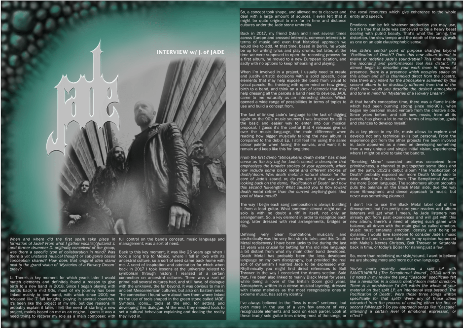This interview was conducted between April 21st and May 5th as a general add-on to the premiere of Jade‘s latest album ‘Mysteries of a Flowery Dream‘ and I was grateful to get a chance to learn more about not only the themes found within the album but also the history of the band up to this point. They’ve long been at the top of my mind in terms of great potential with their own vision of atmospheric death metal and with this new album they’d taken it to a new height, an experience I wanted to know much more about. Needless to say I am also a huge fan of Spain’s (and adjacent) black and death metal scenes today and these folks are a brilliant voice in that greater realm.