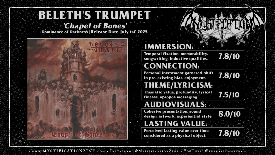Taken piecemeal within a playlist of dissimilar groups Beleth’s Trumpet threaten with a fairly consistent fast pace and a perfectly readable sound yet taken in as a ~42 minute record ‘Chapel of Bones‘ and its insistence on a basal launching speed for their larger melodic riffs means the full listen should begin to feel “samey” or slow to develop by design. This doesn’t so much read as formulaic as it does focused on lining up variations which are consistently relevant to one another on a structural level. That is to say that you’re not going to mistake the mid-paced step of “Clandestine Ritual” verses for the many transformations which occur within the expanse of “Extermination of God’s Dominion” but each song draws a similar course of action and (generally) incurs the same reaction. This is hardly a complaint, moreso a reflection of the tradition and inspiration these folks are sourcing foundation from.