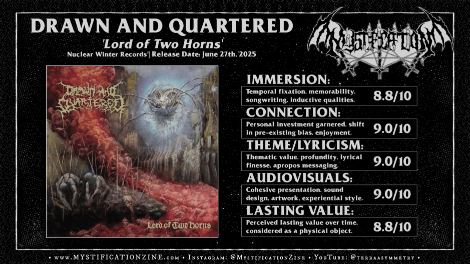 A ninth abominant form arisen under clawed commandeer of the chaotic forces of nature, He who must destroy is once again summoned to obliterate all idolatrous hordes through trampled-out, blood drenched genocidal cull. The chosen vessel for annihilation is none other than Seattle, Washington-area death metal quartet DRAWN AND QUARTERED who crush and twist all skulls under boot via this wrathfully clobbered-out ninth full-length album. The devotee can approach ‘Lord of Two Horns‘ with blind confidence and find their well-proven blasphemic accost intact, fuming here with infernal brutality pouring from every piece as the band’s signature and high standards are upheld. For the uninitiated the band’s 90’s underground sourced and USDM informed vision remains approachable from all angles as they add yet another uncompromised and inspired release to an already indomitable discography.