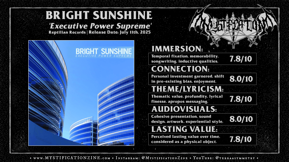 We, the high-powered businessmen behind Mystification Zine, wish to extend our appreciation to Tempe, Arizona-based noise rock/punk upstarts BRIGHT SUNSHINE for the dynamic and exuberant energies they’ve contributed within this latest album, ‘Executive Power Supreme‘. All work surpassed the minimum expectations for excellence. We seek deliverables that are profoundly impactful, consistently embodying maximum effectiveness —akin to the most “classic” transcendent soundscapes, a -product- which reads as an elevated experience to the average consumer. Here they’ve met exceptional standards for explosive sarcasm, a balking dread reminiscent of “going postal” in an office-type setting with strong, believable characterization. Brilliantly psycho stuff, well worth checking out.