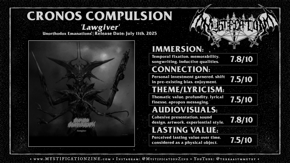 Denver, Colorado-based death metal quartet CRONOS COMPULSION return several years beyond their debut EP with their first full-length album, ‘Lawgiver‘ and it more-or-less continues where they’d left off. Readied to sprawl into dissonant, grinding fare from the outset these folks bring even more suffocating and sludgy death metal here as they provide a “critique of late-stage capitalism” in theme. At ~24 minutes and nine songs they’re in and out with their ideas quick, running out of steam early on as the experience reads about as primitive and plain as one’d expect in line with previous material where their songs were short and their sound primitively struck. While this is a fine enough record it, like so many other death metal albums out of the United States/U.K. in recent memory, relies far too much on hardcore induced riffs and song structures to the point that it lacks in providing repeatable, profound experience. The dry chugging and roaring found on the title track was the nail in the coffin here in my experience, a typical translation of beatdown hardcore into something like mid-paced death metal where its brief and slow-grinding movement doesn’t seem all that sure of what it is or where to take that core idea beyond a breakdown or two.