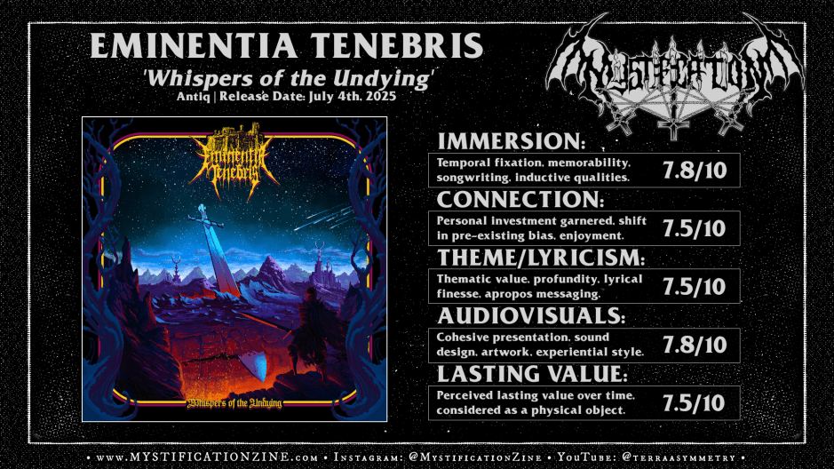 Le Mans, France-based epic atmospheric black metal project EMINENTIA TENEBRIS return for a fourth full-length album in ‘Whispers of the Undying‘ where the band delve deeper into folken-atmospheric melodicism at a stride which escapes the cold and dark distance depicted within previous albums, colorizing their work with “symphonic” and power metal-adjacent musing. This features in more of a heroic stance, anthemic wonderment (re: “Beneath the Moon”) which flows from one piece to the next. The guitar driven and sometimes string-braced melody here is not without substance but their implementation is at times indebted to the Scandinavian expression in terms of any wrathful-toned vocal cadence and the aplomb of their drummer’s chopping movement. Their otherwise oaken and “epic” result is often caught between atmospheric intimacy, a sort of escapist tirade soldiering away, and the vaunt of that initial symphonic black read. There is a sincere dramatic tone struck here which almost escapes its colorful high-fantasy imagery yet the overall effect is relevant to both this style of black metal and heavy metal in general.