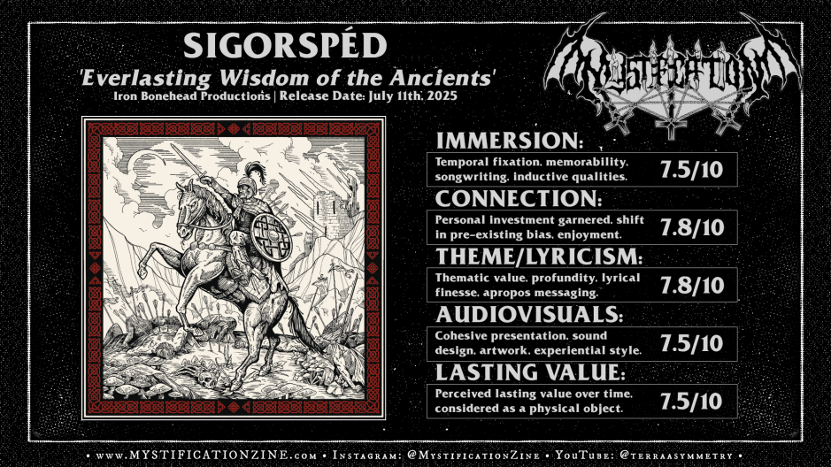 After spending some reasonable amount of time with each of the bands indicated within the Order of the Broken Sword I haven’t encountered any truly standout effect or invocation. Their work in SIGORSPÉD‘s debut LP ‘Everlasting Wisdom of the Ancients‘ bears a non-specific atmospheric whim to it which is mechanical, allowing too much space for their bland drumming in the mix and following along too closely. The main vocal thread appears in service to the chasm applied, an animalistic and ragged expression which reads as a war metal application considering the false reverb caked around the edges. The band present a pagan aesthetic and intent by suggestion and the fantasies of power and adventure explored within aren’t served well by the riffcraft. When setting aside the drum sound and effects-garbled sound design the temperament of the band the main question here for my own taste, it conveys very little in the way of wrathful violence, misery, or fantastic wonderment beyond a melodic line or two on later pieces (re: “Requiem for the Fallen”, “The Ties Which Bind an Eternal Brotherhood”). There is an interesting idea which sits beyond the cobbled together feeling of Sigorspéd‘s work though this LP doesn’t manage to stand out all that much. Luring have become more interesting with each pass and I believe this band will follow suit with iteration.