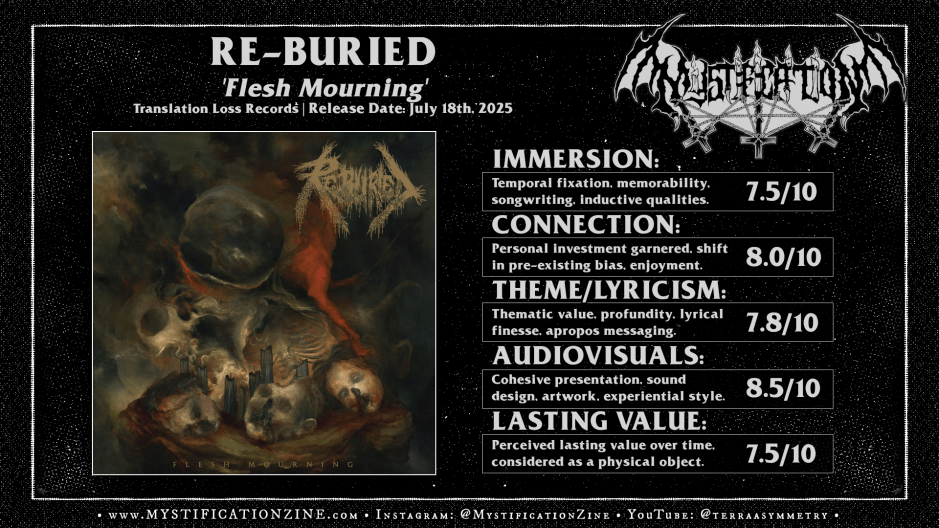 An altar built from cadaveric ornamentation and lit via morbid invocation peers back through the haze of black candle smoke, the awakening of a long-dead spectre in response to the horrified grinding of Seattle, Washington-based death metal quartet RE-BURIED. Developed in direct refinement of their first summoning ‘Flesh Mourning‘ is a proper sophomore LP which builds upon past work with a mind for varietally engaged extremes, acts which speak to both ancient underground sensibilities and the muddier step of ‘new old school’ fare alike. The result is brief and familiar yet these folks’ve served a satisfyingly detailed full listen, taut enough to bring doom and gloom to their riff-built sound but without indulging in overbearing repetition or dryly moshable generica.