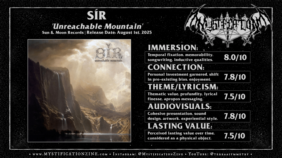 Expressing the dread and defeat which hangs heavy within the individual’s psyche upon realization that the escapist utopia long imagined from afar as a point of solace is ultimately unattainable as a destination this sophomore full-length album from Hungarian dark death/doom metal project SÍR arrives surprisingly developed, refined beyond an awkward debut LP. Conjuring its own form of dark metal via romanticist death/doom metal, traditional doom and depressive rock traits ‘Unreachable Mountain‘ presents four deeply immersive lamentations which mourn the dream of respite via haunting and occasionally ambitious explorations. Though the pieces of their new formulation are recognizable in element their collective effect is entirely unique and well worth checking out per the adventurous doom and dark metal fan.
