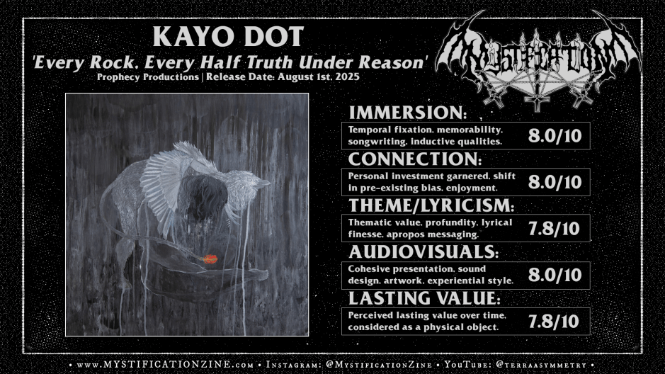 Rather than coming “full circle” in the usual way and drawing a predictive line back upon one’s fading ghost of “self” this eleventh LP from Toby Driver‘s KAYO DOT use their brilliant 2003 debut release ‘Choirs of the Eye‘ as a foundational idiom for deeper abstraction. Self-identifying the result, ‘Every Rock, Every Half-Truth Under Reason‘, as “liminal metal” and pursuing unpredictive, anti-normative composition within the original line-up returns intending no direct reflection of the past. Tension is achieved here through microtonal instrumentation in minimal droning statements sans any sort of “rock” gait. Cold, at times hymnal tonal pooling of organs and frustrated shouts are the main ear-catching force here but they come gilded with oddly set percussion and wavering strings for an unkempt avant-jazz tinged container. The tag given works in this sense, always on the edge of a rounded thought but never indulging it and to the point that whole of the album reads as a collapse of reason, a sort of noir derangement designed which bites and gnashes for its first several pieces.