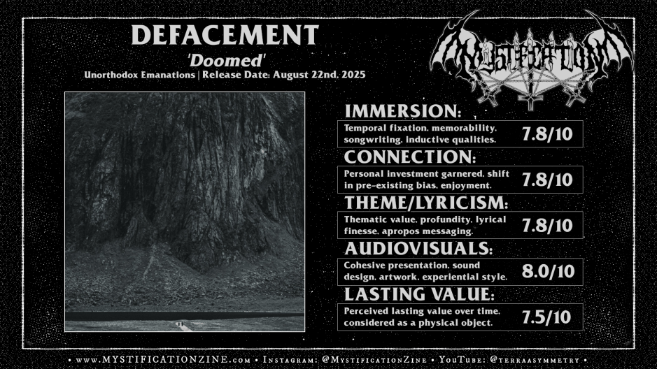 Struck down by their own thoughts and heaving against the pressure of dread-borne ail avant-garde death/post-black metal quartet DEFACEMENT access both chaos and catharses in expressing a wracked psyche in the midst of bargaining against its own collapse per this fourth full-length album. Still exercising their experimental node but streamlining the inherent combination of forms available ‘Doomed‘ expresses both nihil and lament via variously excitable and introspective pieces which arrive irregularly shaped and howling in their midst. There is no relief in the end, no neatly sewn-up closure of the wound carved here so much as the gutting of the self is worn openly as the artist(s) process despair through erratic, heavily layered post-death metal confrontation and black-gazing escape ’til the thought runs its course.