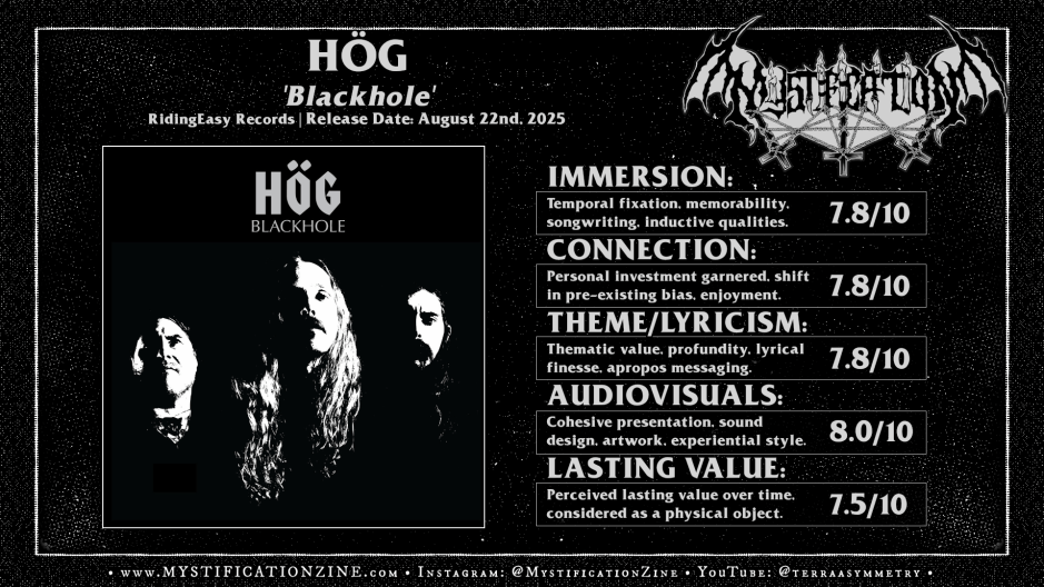 Despite coughing up eight chunks of defiant, world-weighted estrangement and a handful of despairing lows as they truck through thier debut full-length album Portland, Oregon-based heavy rock trio HÖG appear high on life and getting theirs on ‘Blackhole‘. Formed just a few years ago and road-readied soon after these folks’ve done well to make the connection between the heavy blues driven swing of the early 70’s and their own punkish take on doom-rock per this surprisingly well-formed LP. The effect is simple enough and the viscera of their work isn’t exactly mind-bending as a feat yet all of it hits for the sake of the considerable energy they’ve cranked into the void here.