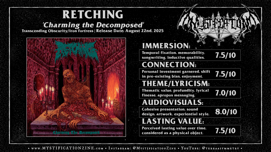 Rhode Island-based gore-obsessed death metal duo RETCHING self-released this debut LP late last year via Bandcamp but now about a year later it has been picked up by Transcending Obscurity and Iron Fortress Records. I think at one point last month I had eight of these “new old school” style death metal albums in hand and barely three riffs among ’em, so, I dunno if the ninth down the line stands out enough to shock my shit loose but ‘Charming the Decomposed‘ is not a bad record in any sense. Most of these ~four minute grindcore and brutal death stoked songs aim for eruptive aggression beyond a number of dryly curated samples and yet this isn’t just another boring mosh metal riff band pretending to like ‘old school’ shit. A few of the walking-speed riffs in the second half of “Premature Decapitation” actually hit and there is a satisfying buzz to a song like “Foaming” but I dunno if the typical sub-genre enthusiast will escape the feeling they’ve heard it all, if so inclined. Great sounding record though for all the time I’d spent with it virtually none of it stuck in mind, there are too many bands that sound like this in 2025.