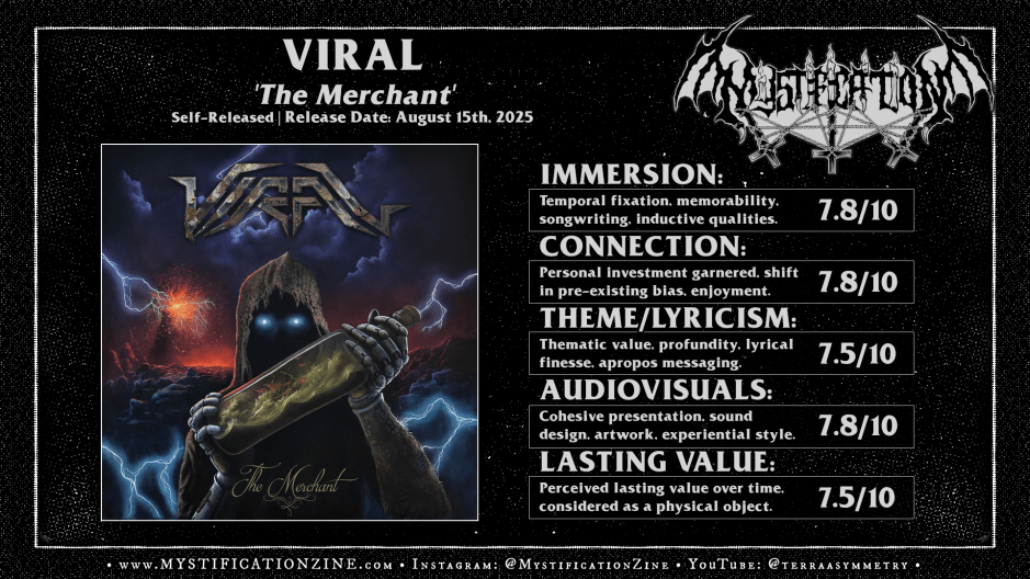 Linköping, Sweden-based heavy metal quintet VIRAL have returned for an even more inspired second full-length album with ‘The Merchant‘, another respectable self-released prospect from these folks. Though they carry a shared love for the melodic nature of NWOBHM as a point of purpose these folks likewise draw from thrash, power metal and heavy rock for their traditional sound, one which admires the range of NWOTHM stuff in more recent years but carries a pretty steady swagger without the AOR/Gothic side of things in sight. You’ll hear Maiden in their movement here and there but also shades of Megadeth‘s rhythmic runs and Manilla Road‘s cadence (“Bow to Me”, “Oceans”) alongside kinda standard hard rock oriented songs (“Maverick”). I’d felt their sound was hard-edged enough to carry all of these guitar driven statements within reason though their use of melody is largely relegated to 80’s heavy metal ideas without switching it up all that often, this means a song like “Enigma” hits nearly the same as opener “Shake Your Shackles” though each provides an ear catching and complete thought. They break things up a bit more nearby the end, those last couple of songs suggest a mix of epic storytelling and speed metal is the strength of the band though in their current self-driven state the standards are high and the music reasonably memorable. I saw a lot of promise in their self-titled debut a number of years ago and here I still feel like we’re getting an authentic self-directed result and good solid Swedish heavy metal in general.