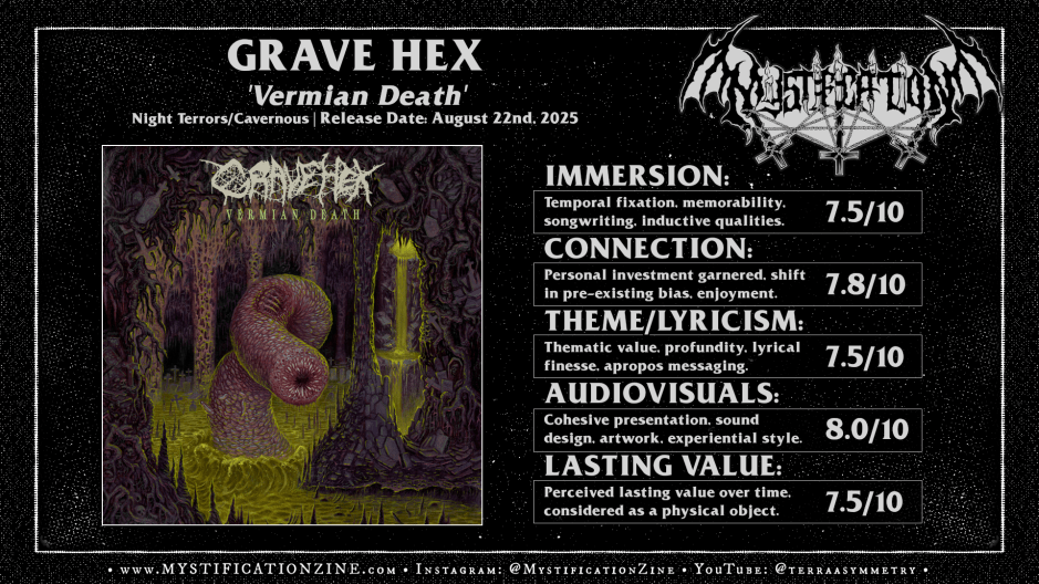 Grave Hex have the right idea here in terms of curating and performing something adjacent to classic death metal forms and standards, particularly when it comes to their sound design, but also per the imagery on hand. The cover artwork from Slimeweaver has a certain subterranean horror-toon quality which suits the muddier, groovier sound of ‘Vermian Death‘ well. There is a fine line between generica and simplicity in this realm and from my point of view what keeps it all from landing by-numbers in this case boils down to presentation, not only the look and sound of the record but how they’ve stacked the tracklist into tonally related portions. Otherwise my biggest criticism here is that a ~27 minute debut LP is more of an outsized EP, the whole deal reads like two-thirds of an actual full-length which is notably lacking for any sort of killer, momentum setting opener. I’d had a great time with this album but only for the sake of persisting with it for a bit and getting the bigger picture, there is yet a ton of serious potential here in terms of these folks showing up prepared with the bigger picture applied to a death metal album experience even if the songcraft is at-times hobbled by the dryness of the current status quo. A moderately high recommendation.