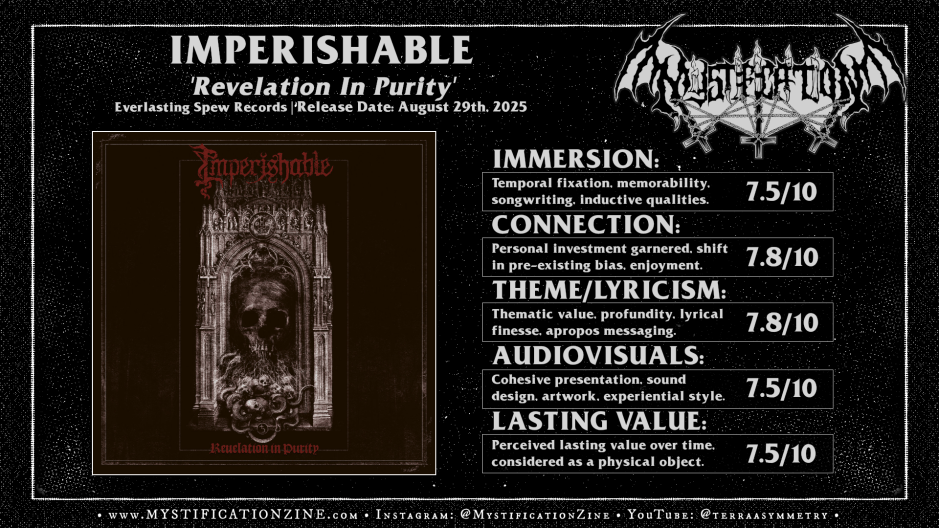 Aforementioned closer “The Enduring Light of Irreverence” went a long way towards anchoring the potential of this project in mind as a seven plus minute diatribe built upon a similar foundation of death-grinding speed, blackened flourish and congested Morbid Angel (or, more recent Nile even) slung riffcraft set to stampeded and waltz depending on the moment. This is where the details available to their lead guitars and basslines start to pop out like loose springs and generate interest, almost indicating a more prog-death exaggerated evolution might be worthy pursuit. After sitting with the closer alongside the rest of the album Imperishable appear less tentative in this debut LP statement but the full effect hasn’t quite made the complete connection between their largely 90’s-braced points of inspiration. With that said their core idea is evident and the album generally well executed. ‘Revelation in Purity‘ is a fine enough debut, a short but eventful listen for those inclined, but to hit the potential suggested within they’d have to push this sound further in all directions. A moderately high recommendation.
