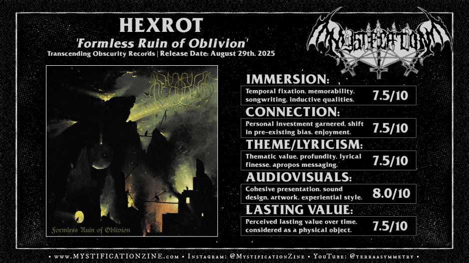 Massachusetts-based duo HEXROT open this debut full-length album sounding like a 2010’s sludge metal group covering late 90’s Death with some manner of dissonant black metal technique serving their rhythmic abstraction, unfolding into various points of disarray and respite throughout a largely seamless listening experience. Rather than build death or black metal songs in proper structure most of these pieces are contortions, jammed out ideas in pieces which segment into movements that’re rarely given traditional feature. In this sense ‘Formless Ruin of Oblivion‘ should appeal to fans of underground progressive metal foremost in this current state. I’d particularly appreciated the springing-loose bass guitar tone as it’d both noodled through and braced each segment though the vocals and guitar work were hit-or-miss for my own taste as spectacle, though certain sections pinged the part of my brain that enjoys spastic improvisation be it noise rock skronk or jazz fusion tipped wrangling. While I’d enjoyed this record on the first couple of spins it isn’t the type of record I’m prone to cling to beyond first ascent, reading as an exercise of forms and experimentation that might read better in person performance. Otherwise I’d enjoyed the sound of this record, the production values and the treatment of the general layers, an organic feel and “real” space given to sometimes chaotic or hard to read movements feels like a luxury for a band this early in their development and presents a high standard they should uphold.