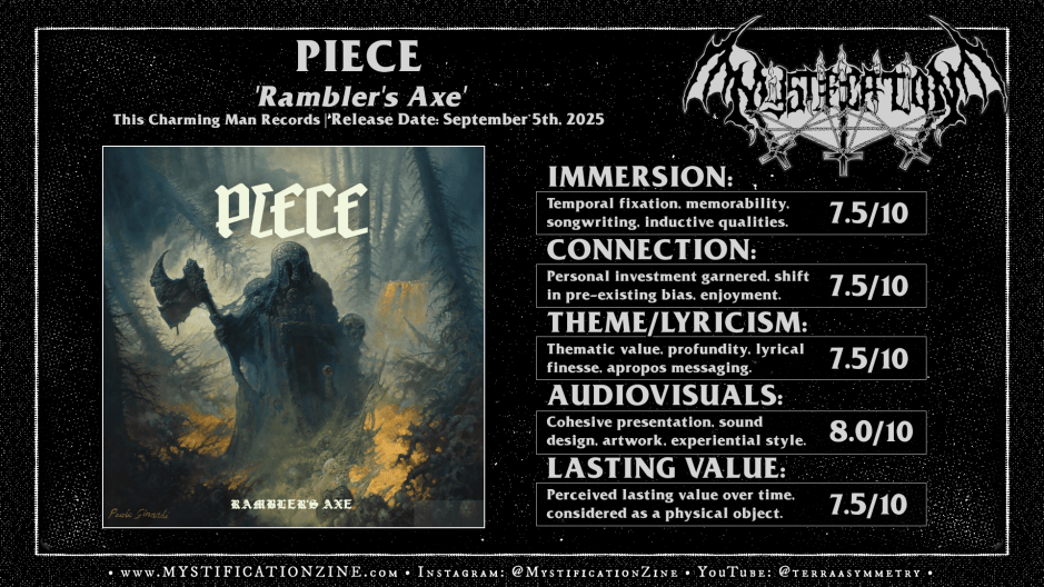 Trading in dark fantasy imagery and lumbering, fuzz-bolstered heavy metal muse Berlin, Germany-based sludge/doom metal trio PIECE both iterate and mutate their familiarly set craft on this finely curated sophomore full-length album. As a thoughtfully shaped listening experience ‘Rambler’s Axe‘ is comprised of entirely approachable, crowd-pleasing stuff built from fairly obviate inspiration which fans of popular sludge metal will appreciate. Though we couldn’t accuse these folks of any particularly original thought herein what their efforts lack in personage and depth is assuaged by fine production values and an overall huge sound.