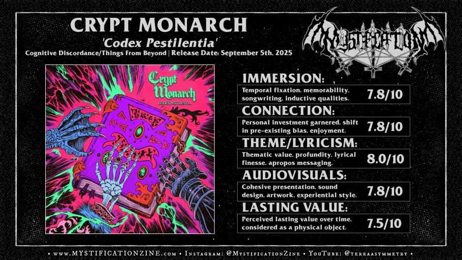 Any fan of kinda aggro sludge/doom metal given to the buzzing, stoney realm of psychedelia induced exaggeration will be more than comfortable following the tale of ‘Codex Pestilentia‘ by vibes and sonic lustre alone…. but the lore/world building suggested here is inspired enough that my experience with this album held it above-average. Better looking, better sounding and altogether put together in a way that carried more of its own personae in hand the major triumph of the Crypt Monarch‘s second time around ends up being greater distinction from their related projects as their work tells an entertaining story and keeps it heavy, or, active throughout in a way that is never cheaply cinematic or given to too-broad gesturing. A moderately high recommendation.