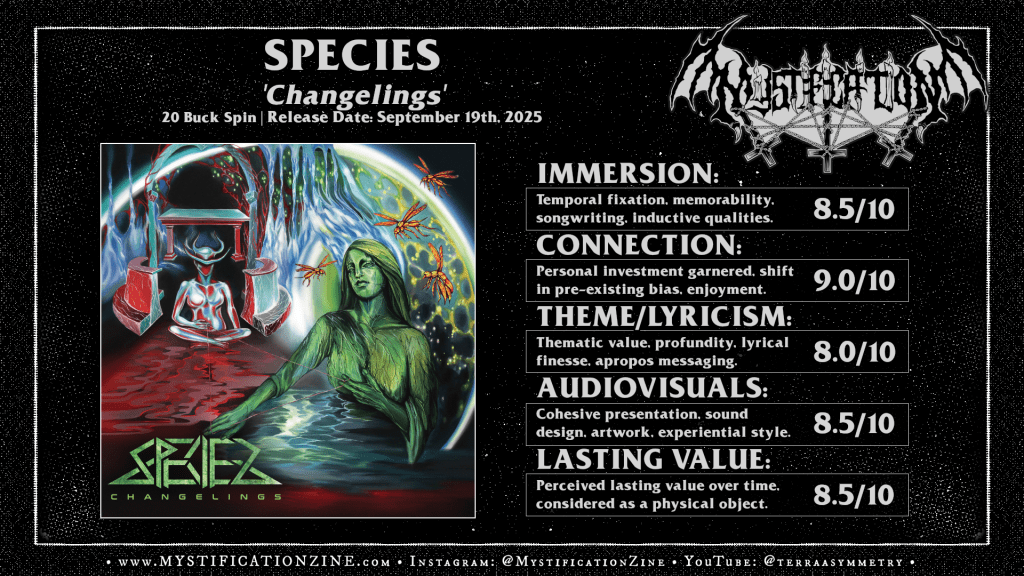 Only the strictest adherents to this space will recall my years-long obsession with this general sub-genre, the exploration of it in full and such, and this of course generates some unruly hype on my part as an undying fan of technical thrash metal and all that it’d spawn. With this in mind I’d suggest ‘Changelings‘ both speaks to the proclivities of emergent technical thrash metal (techno-thrashers if you’re EU adjacent) and its own tunnel vision of rapid-firing ideas with the latter ultimately taking over in a way that the previous album hadn’t fully grasped. Beyond that point Species‘ve created an album that worms in mind with each listen, a technicolor sluice through imaginative but never avant-garde estrangement with a clear search in mind. In this sense following their seeker through its train of thought was consistently transporting, a pleasure to leave on repeat and weave through its maze-like sojourn. A very high recommendation.