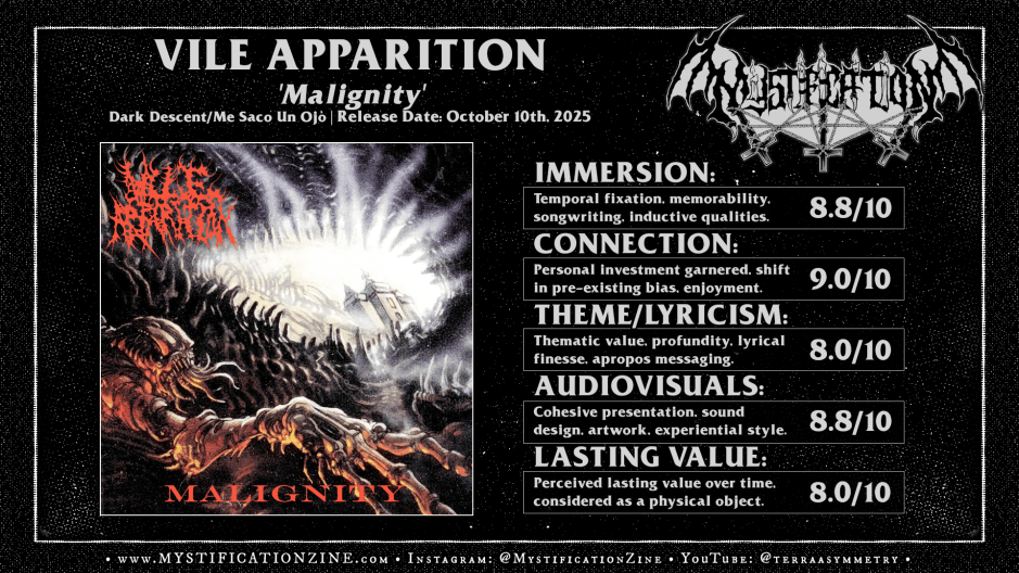 There was no denying Vile Apparition‘s latest the moment that first song hit its volcanic lead and ‘Voracious Contempt‘ worthy groove at once where the surreal and the violent mechanism driving ‘Malignity‘ was exposed like a raw nerve that’d remain firing off for the duration of its ~34 minutes. Any fan of the human-handed brutality of 90’s death metal will naturally appreciate the look, sound and friction of this record in passing but folks especially in tune with pre-millennium brutal death will be the exact target for this one. Count me in with that crowd but with some extra thumbs up given for the changes made to their sound design (drums esp.) and even more active ‘old school’ technical death nods found throughout. A very high recommendation.