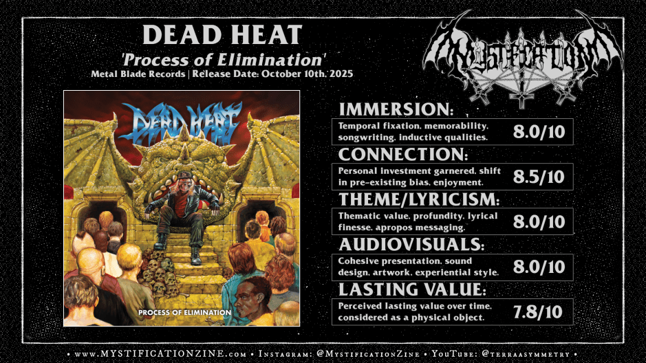 Dead Heat have always been a solid band, so, I wouldn’t sum my thoughts on this record suggesting they hit on something any more (or less) special by doubling down on my favorite era of thrash so much as that this latest record only bolsters their whole discography, adds something a couple shades harder to an already choice thread. That said I’d found ‘Process of Elimination‘ so focused on a mechanically sound, amped-up and riff-heavy version of crossover thrash that it’d nearly forgot to crack off on a genuinely catchy song in the midst and this was the only thing that’d kinda held back on the full listen. Still I’ve got to give credit where due, this work is up there with the current all-around high standard for this sub-genre and fans should accept nothing less. A high recommendation.