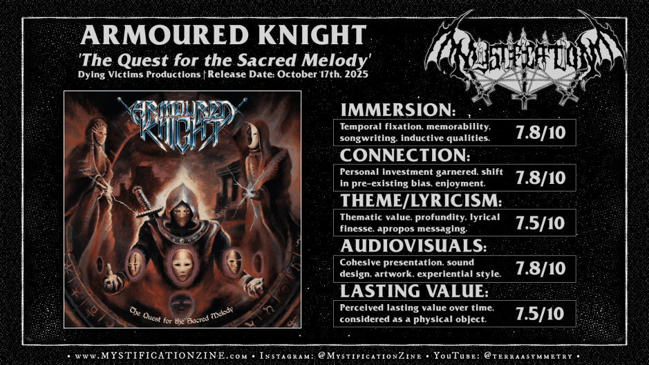 Revivified, returned and no less inspired by the nascent glories of a classic niche Peñaflor, Chile-based heavy/speed metal quartet ARMOURED KNIGHT arrive upon their debut full-length album intending to invoke the early evolution of power metal beyond its speed metal boosted origins. ‘The Quest for the Sacred Melody‘ is naturally an 80’s metal record in this regard and a melodious one at that while still bearing the muscle memory of the rugged faster paced arms race of a bygone era. While the result is not adventurous beyond those general climes and may not prove heart-stoppingly memorable their work still speaks directly to an authentic fandom which escapes any too-rote emulation of storied greats.