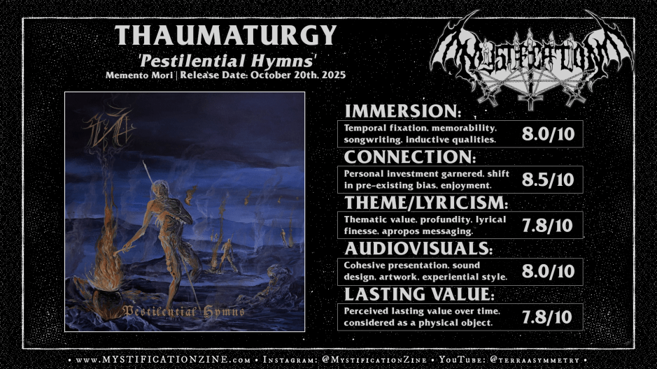 A cursed offering of madness flayed and jettisoned into void this sophomore full-length album from Kansas-based atmospheric death metal band THAUMATURGY promises a despairing collapse into death magick and rabid lunacy as they successfully transition from solo act to notable trio. Skinned and melted atop their own pyre these pieces illuminate as they burn, revealing depth within a previously dim-lit cavern as arrangements sophisticate and expression swells within ‘Pestilential Hymns‘. Their grip upon dread only tightens as a unit where collective broad-yet-classicist tastes surprisingly suffer no heinous congestion or ruinous clash herein and that focus makes for a distinct and even more engaging second record.