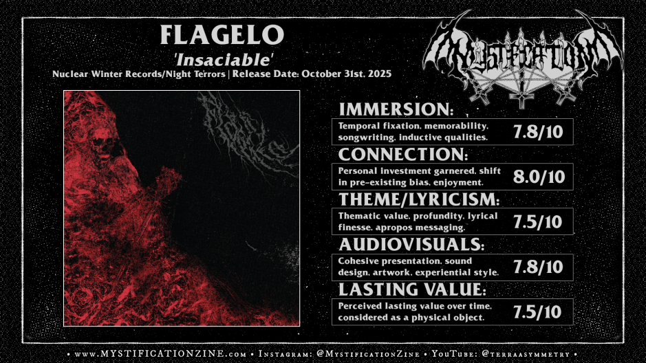 The amorphous strand revealed within ‘Insaciable‘ is without a doubt monstrous, imposing enough to create an entertaining spectacle on-record and in this sense a case for a smeared about ouevre is successfully made tough I can’t say that every element here does more than check a box before moving on. The appeal of what Flagelo have put together is clear enough though I think a more compelling case is made on the second half of the EP compared to some of the quickly referential ideas found on say, “Viral”. With that said checking all of those boxes does create the sensation of variety, of a trip through their grotesque meld of blackened death with elements of grind, sludge and doom. I figure the appropriate response is the desire to hear more, that it is clear they’re building something experiential and appreciably atmospheric from these parts presented thus far. A moderately high recommendation.