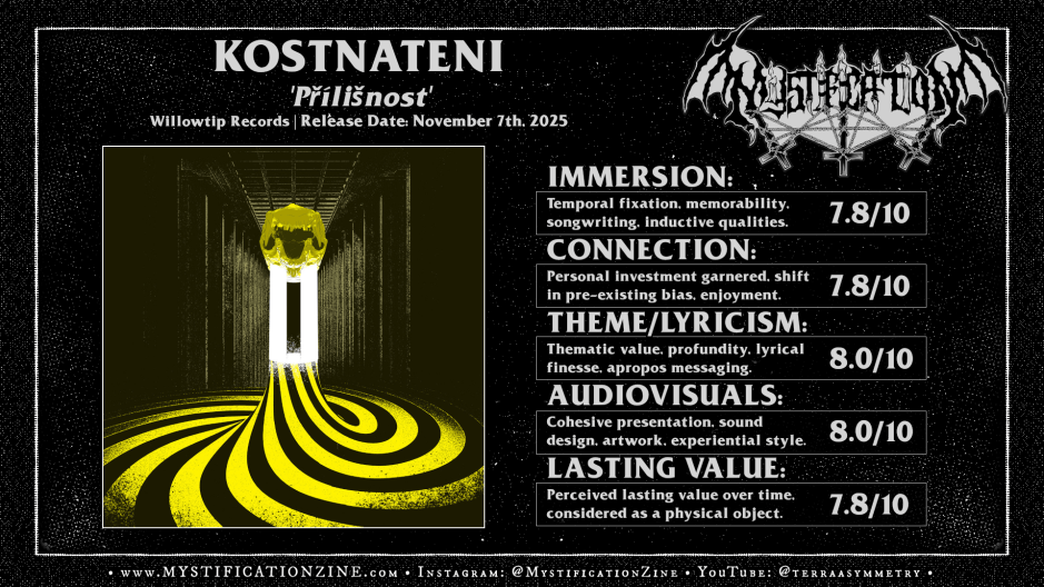 In brief yet dense examine the self-destructive qualities of the introverted perfectionist in pursuit of external valuation are parsed and pained by way of this third full-length album from Minneapolis, Minnesota-based progressive/avant-garde metal project KOSTNATĚNÍ. While there is a certain many-armed exuberance to their myriad pursuits within ‘Přílišnost‘ what potentially glues the experience together is the discomfort of self-examination felt, a sensation of deeply internalized exceptionalism being exorcized from the artist. In reflecting the thousand-mirrored realm within the mind their work finds its boldest-yet step away from the strictures of black metal attunement and now thrives within freely pursued but no less affected vision.
