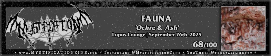 Once again aiming to pull the human soul back to primal Olympia, Washington-based duo FAUNA return after thirteen years for a fourth full-length album which takes inspiration from the most ancient cave paintings known to man. ‘Ochre & Ash‘ relights their curious take on “Cascadian”-adjacent atmospheric black metal with alternating ambient rituals and longer-form guitar driven songs. Their work here takes a walk from cavernous realms (“Nature and Madness”) to sprawling release (“Labyrinths”) and some manner of cyclic transference beyond death. The most stunning piece here is of course the ~23 minute conclusion per “Eternal Return” with its chorale in the final third and extended intro though I’d enjoyed the entombment of “Nature and Madness” nearly as much. For an hourlong record from a band I’d forgotten existed this was surprisingly entertaining, a yank back in time from a couple of different angles.