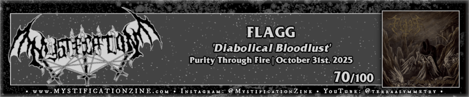 Turku, Finland-based duo FLAGG once again stab deeply at both the malevolent and melodic on this third full-length album sparking up ‘Diabolical Bloodlust‘ with one of its more inspired pieces, “Storming the Gates”, to great effect. From that point there are plenty of pieces which give room to breathe, “Morningstar Rising” for example carries a feasible mid-pace even with the rocketing hands of drummer Krzysztof Klingbein in tow, yet the vocals just don’t do anything here for me as a sort of backgrounded but always escalated crowing atop each movement. None of this is unusual for black metal in any sense but in this case vocal placement detracts from the directive of these arrangements for my own taste. It isn’t a bad album at all, though, another sharply writ but not exclusively traditional approach from the artist which makes good use of keys without fully cheesing out.