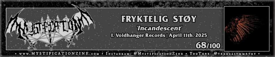 Although the name of solo atmospheric black/doom metal project FRYKTELIG STØY is Norwegian the solo artist behind it, Em Støy, is based out of Victoria, Australia and is probably best known for early contributions to black metal band Thrall. I’d generally had difficulty finding much of anything to say about their second LP ‘Incandescent‘, a perfectly decent atmospheric doom record which carries some manner of atmospheric sludge expanse (see: “Radiant”) while carrying a very “black metal lite” feeling through just a couple of songs, such as opener “Black Swan”. While I felt there were sound ideas here, such as the dissociative clangor of “The Ocean” or the haunting “Guide”, their execution is strained by ambition and particularly with regard to the vocals. Without any one clear knack on offer their efforts all become a bit backgrounded and despite a decent showing in terms of variety.