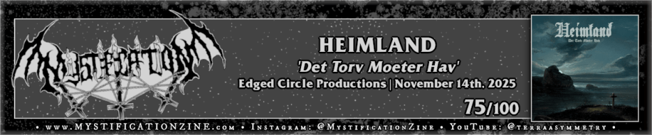 Though they’ve undergone some serious refinement in terms of production values and road-tightened performance Rogaland/Bergen, Norway-based black metal quartet HEIMLAND still generally resemble the tradition of pagan black metal to some strong degree on this second full-length album. ‘Der Torv Moeter Hav‘ doesn’t dabble in keyboards or an outright folken edge so much as their own straight forward cut but that shouldn’t indicate they’re calling back to the usual classics. Here each song revolves around some manner of melodic lilt, with a few even breaking into what I’d consider black n’ roll interruptus (“Spre Mine Asker”) which to me recalls a couple of specific scenes of the late 90’s… without becoming stuck there in devout purpose. In this way think of Vried or Taake more than anything else as a general starting point. In terms of rallying more riffs than their debut, which I’d reviewed in full back in 2023, this record is a success as it generates more consistent interest overall. With that said it is probably too focused, lacking more than a “modern” atmospheric take on nostalgic sounds.