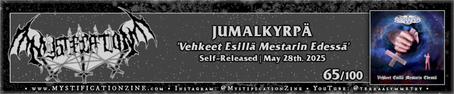 Kristiinankaupunki, Finland-based solo act JUMALKYRPÄ were recommended to me as a melodic black metal band with a “weird soul” earlier this year and I would likely qualify that description with atmospheric bedroom black metal to some degree. Ostrobothnian Dweller‘s vision on is simple enough, an less than equal dance between floaty atmospheric dawdling and the inevitable burst into faster, often frantically scraped out movements. When it works (“Pimeyden Kyrvän Siunaus”) it is compelling but when it doesn’t (“Golgatan Riemujuhla”) it all flops out into an awful mess. Even if it isn’t all that serious or accomplished at face value there is a sort of personality to this work, helped along by the absurdly shit album art, which I’d found worth spending some time with.