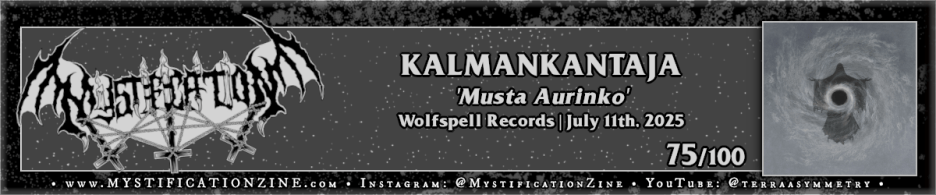 If you remember the vocalist I was complaining about on Flagg‘s album earlier here he (Tyrant also of Malum) is again but this time being brilliantly suited for the ever-prolific Hyvinkää, Finland-based project KALMANKANTAJA who achieve their 28th full-length album (including one re-recording) since 2011. ‘Musta Aurinko‘ is an atmospheric black metal epic from a band I know very little about beyond maybe one Rauta interview from ~five years ago but it seems every few years I am rewarded by checking back in for another record in a different shape or style, in fact this is just the first of two released thus far. There is some manner of reach for the unattainable here, at least on standout “Rautavitsan Veritaika” to start, where the motion they create within cyclic-struck progressions creates the illusion of glowing ascent. This persists to some degree throughout but of course the title track (and “Hirsipuun Alla”, “Korottu Maa”) should cue your ears into something closer to Summoning inspired marching orders and folken black metal verses. I’d really enjoyed this album for that general soundscape, the fantastical glow that surrounds their work was appreciably immersive.