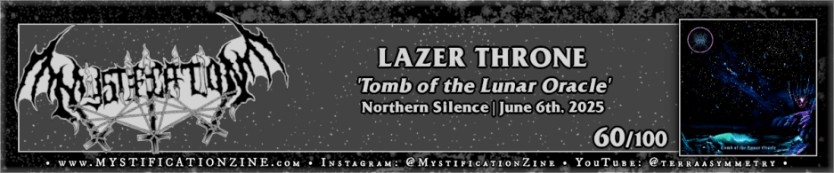 Tucson, Arizona-based solo project LAZER THRONE definitely have a shit name and thier first EP’s aesthetic was some generic AI looking trash… but you can tell the fellow behind it has put some serious time and money into making it a thing beyond that point. For this debut LP, ‘Tomb of the Lunar Oracle‘ we find the usual “funderground” USBM traits where a rock guitar solo is inevitably the focus of each song but but the groan and glisten of cosmic synth does a fine enough job of breaking the monotony of atmospheric tremolo-picked guitar shapes up. It is ultimately bedroom (or, “man cave”) black metal at the end of the day and lacks any real substance per the shortcuts it takes in terms of composition, watering all down with gimmickry and bluster, but I’d found “Dark Star Drinks Her Radiant Tears” a string enough lurch through a melodic/symphonic black idea in this context. The shredding included here is generic and a pain to return to on repeat listens, none of it arriving with a modicum of unique voicing, and this is probably the main reason I’d dropped this one nearly as soon as I’d picked it up.