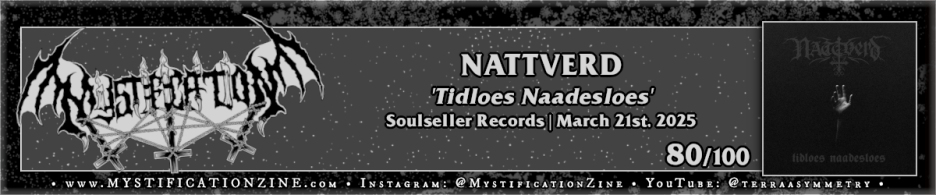 ‘Tidloes Naadesloes‘ is the type of record I’m always hoping to find in a late-year pile of overlooked dregs, some manner of representation for the riff-driven side of Norwegian black metal with menace set behind its eyes. Granted this fifth full-length album from the band is neither stock second wave gear nor a sheer flurry of attacks but instead carries its own groove from the start, particularly “Doedsfugl” where the bass guitar is a featured brilliantly in the context of a slower creeping piece. The more melodic streams of thought which direct “Hvisk Deg Vekk”, “De Sviande Ord Vaagar Ikje For Sitt Liv” and “Udyr” stood out to me most upon repeated listens but the first three or so songs on the album are likely a mostly complete representation of what to expect from the full listen otherwise.