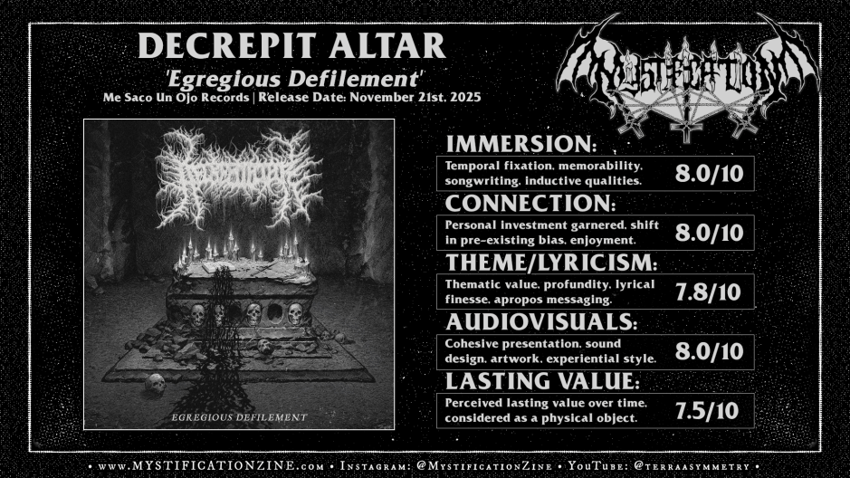Decrepit Altar appear pretty pro here on this introductory set of songs and I suppose the next step is to find some matter of coloration, or directive in their realm that stands out a bit more than this starting point. That isn’t to say that ‘Egregious Defilement‘ isn’t well above-average out the gates, it fully is, but rather that its high potentiate is obvious enough to have already begun building high expectations for the path forward. Still, if they stick to this rumbling, darkly atmospheric vision and only tunneled deeper into the shadows I’d still be praising and listening. A high recommendation.