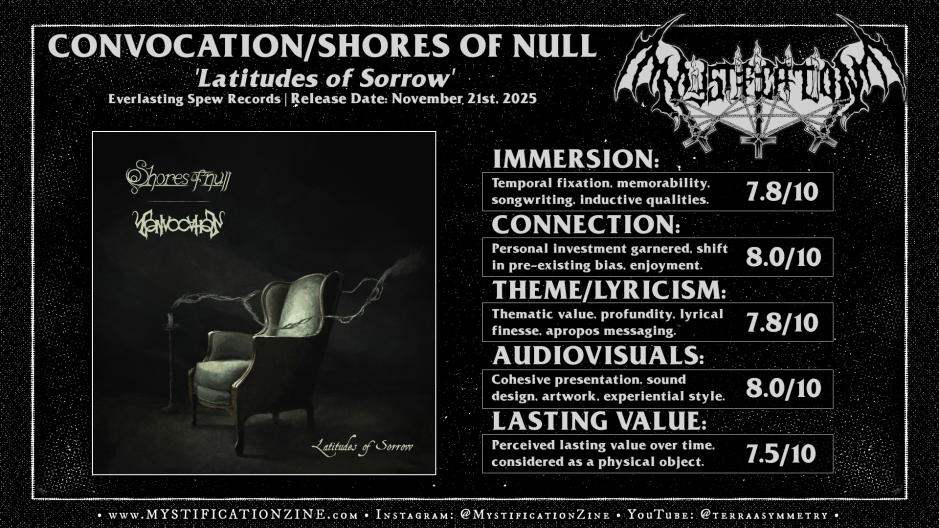 Though they present uncannily contrasting modus in their pairing per this split full-length album Italian gothic doom metal quintet SHORES OF NULL and Finnish funeral death/doom metal duo CONVOCATION yet manage to float their downtrodden wares with reasonable civility, flowing from one spectacle to the next in a showing of communal solemnity. Though it should be clear which half of ‘Latitudes of Sorrow‘ I am squarely interested in the material on both sides is certainly memorable, if not for vastly different reasons. How the dreary intimacy of one shakes hands with the hymnal vulcanism of another isn’t all that clear outright but in either case some manner of profound doom is served.